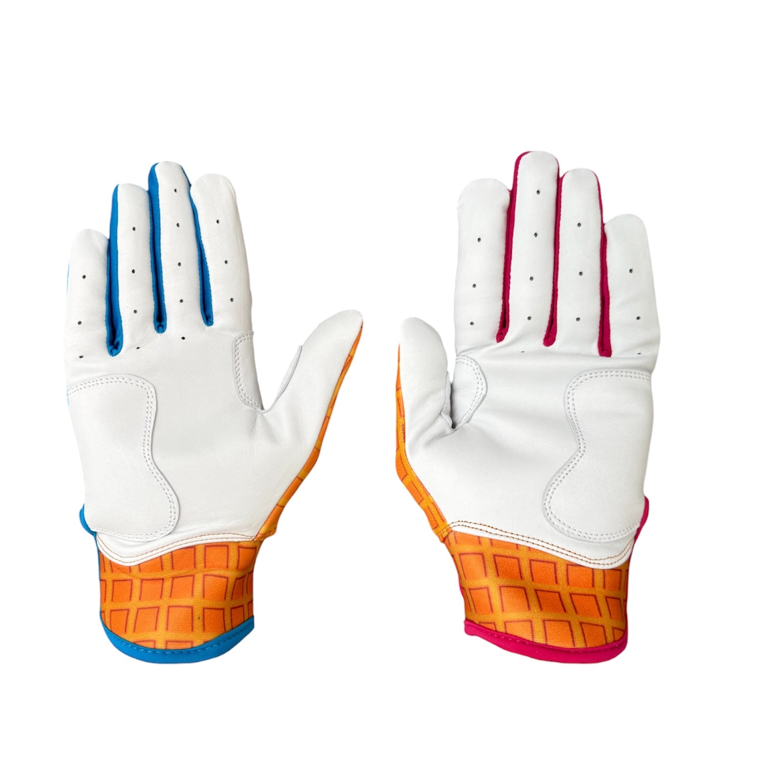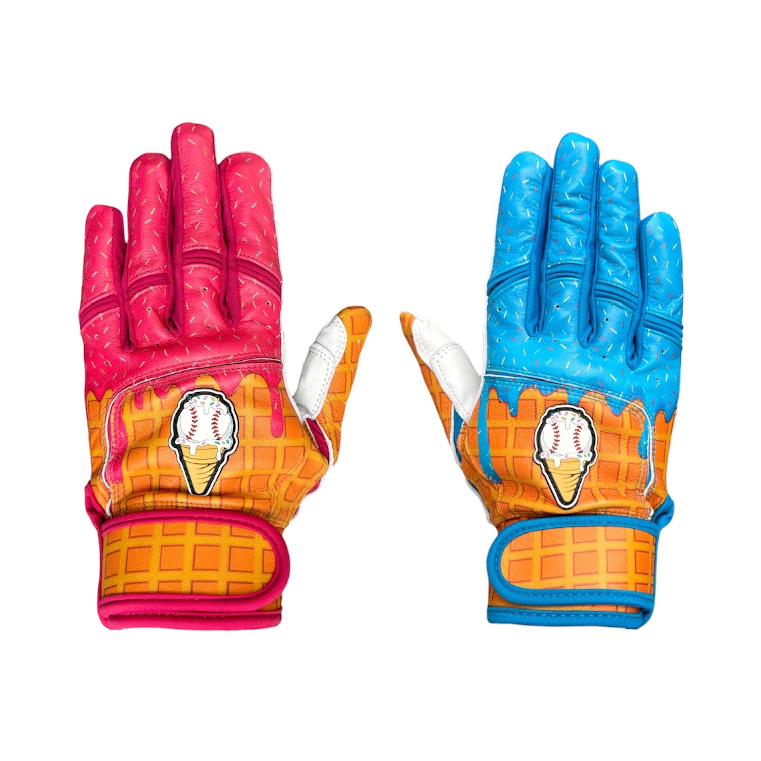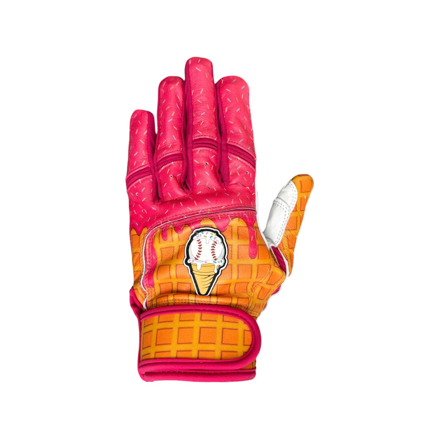 Our Ice Cream Drip baseball batting gloves are built for a clean, comfortable feel at the plate. Soft Cabretta leather in the palm flexes easily and grips naturally, while the camo back keeps a low-key, game-ready look. They break in fast, shaping to your hands with every swing.